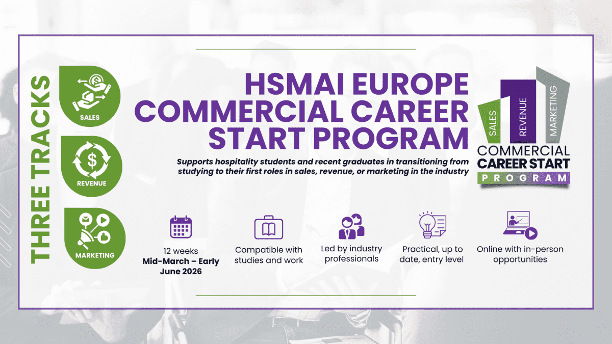 HSMAI Europe Commercial Career Start Program supports hospitality students and recent graduates in transitioning from studying to their first roles in sales, revenue, or marketing in the industry. The program complements formal education by offering a closer look at how commercial roles in the hospitality industry operate today. Through sessions led by hospitality professionals, participants gain first-hand industry knowledge and a […]